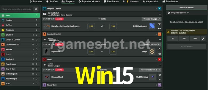 O Win15 oferece uma grande seleção de opções de apostas em e-sports com probabilidades competitivas